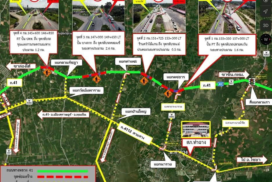 วันที่ 15 ธ.ค.67 สภ.ท่าฉาง ประชาสัมพันธ์เส้นทางช่วงเทศกาลปีใหม่2568 ถนนสาย 41 เขตพื้นที่อำเภอท่าฉาง จ.สุราษฎร์ธานี เนื่องจากมีโครงการก่อสร้างปรับปรุงพื้นผิวการจราจร 4 ช่วง จะทำให้การจราจรติดขัดช่วงเทศกาลฯ บริเวณดังกล่าวจึงประชาสัมพันธ์ให้ผู้ใช้รถใช้ถนน สามารถใช้เส้นทางเลี่ยง ถนนสายล่าง 4112 เพื่อลดปัญหาการจราจรติดขัดบริเวณดังกล่าว โดยมีเจ้าหน้าที่ตำรวจบูรณาการร่วมกับเจ้าหน้าที่ส่วนต่างๆของอำเภอท่าฉางอำนวยความสะดวกการจราจรตามจุดต่างๆและมีป้ายบอกเส้นทาง พร้อมสัญญาณไฟทุกจุดทั้งถนนสาย 41 สายบน และสายสำรอง สาย4112 สายล่าง