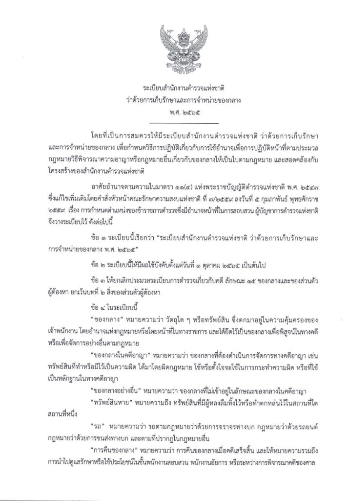 ระเบียบ ตร ว่าด้วยการเก็บรักษาและการจำหน่ายของกลาง พ.ศ.2565คลิ๊กอ่าน